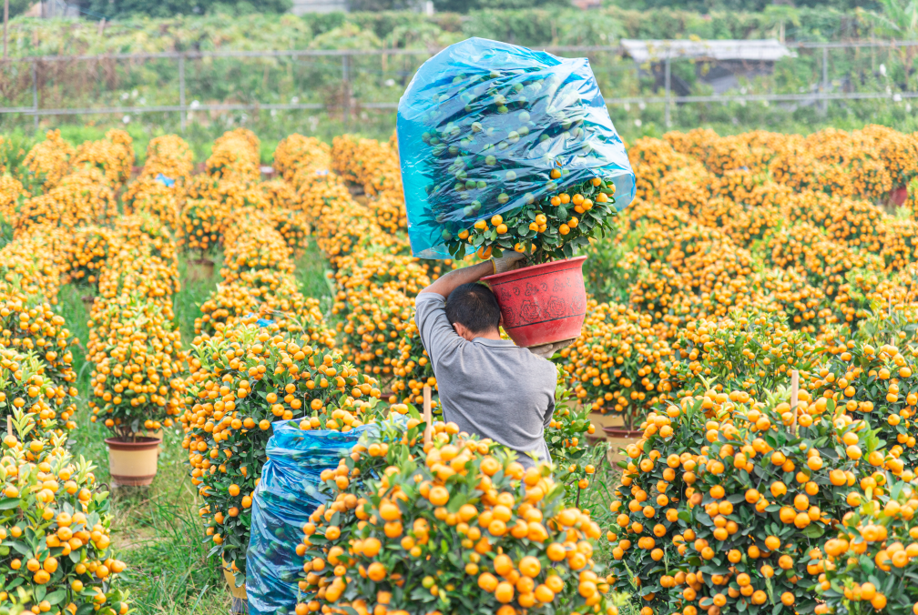 △2022年1月21日,廣州南沙區魚窩頭細瀝村的農田上種植了大量年橘盆栽,枝頭上掛滿了果實,正在現場出售中。