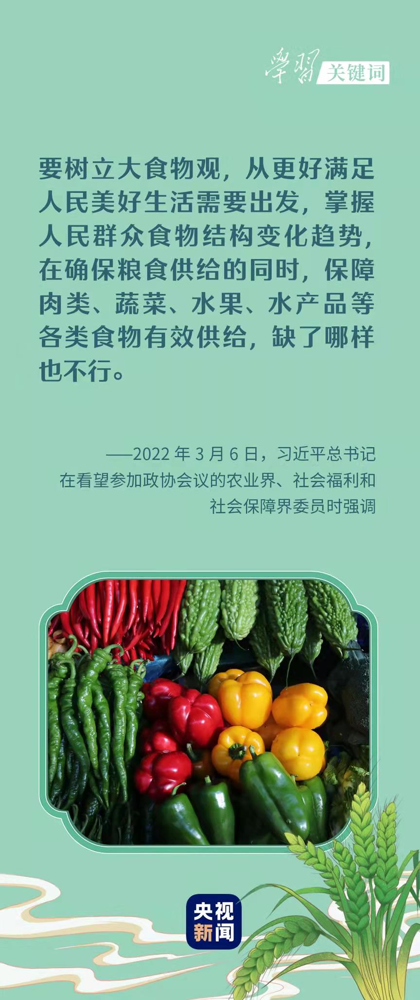 3月6日,習近平總書記在看望參加全國政協十三屆五次會議的農業界、社會福利和社會保障界委員時,強調要樹立大食物觀,從更好滿足人民美好生活需要出發,掌握人民群眾食物結構變化趨勢,在確保糧食供給的同時,保障肉類、蔬菜、水果、水產品等各類食物有效供給,缺了哪樣也不行。