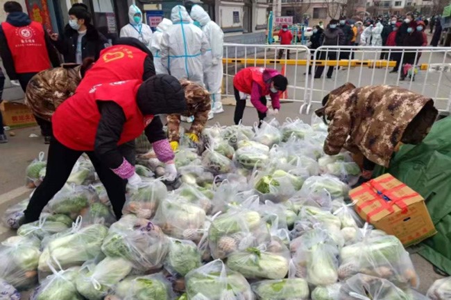 沈陽市渾南區的志愿者為居民配送“蔬菜包”。莊昕 攝