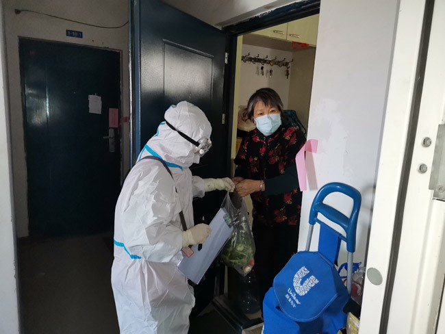 明南社區工作人員上門為居民送菜。杜娜 攝
