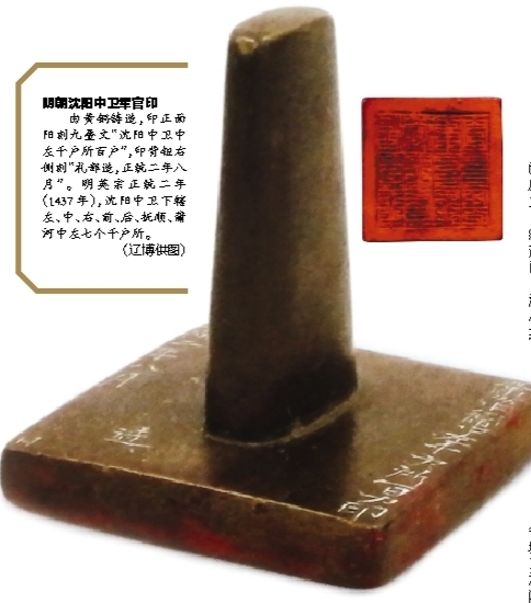 明朝沈陽中衛軍官印 由黃銅鑄造,印正面陽刻九疊文“沈陽中衛中左千戶所百戶”,印背鈕右側刻“禮部造,正統二年八月”。明英宗正統二年(1437年),沈陽中衛下轄左、中、右、前、后、撫順、蒲河中左七個千戶所。 (遼博供圖)
