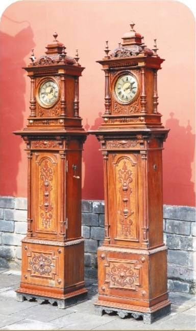 沈陽故宮有一對清宮木樓筒子鐘,總體造型和雕花圖案雖為歐洲文化特征,但所用材料和制作工藝更多是采用我國傳統方式,反映了中西文化的交融。還有一幅慈禧太后的照片,可以看到案幾上擺著一座用玻璃罩子保護的塔式西洋鐘。另有一幅清《光緒大婚圖》,兩對四件“銅鍍金四面轉花鐘”極為搶眼。