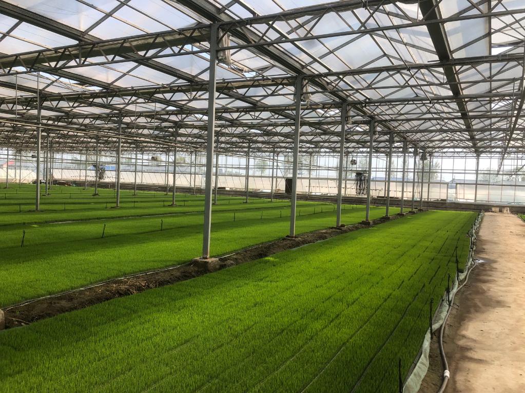 記者來(lái)到遼寧省盤錦市太平凱地農(nóng)機(jī)服務(wù)專業(yè)合作社,整齊排列的20座育苗大棚里,綠油油的秧苗茁壯成長(zhǎng),正陸續(xù)往5000畝水田里“搬家”。