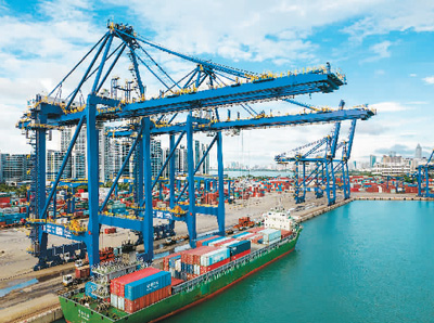 5月11日,海南省海口港集裝箱碼頭停泊著多艘大型集裝箱船,港區車來船往,裝卸繁忙。 |