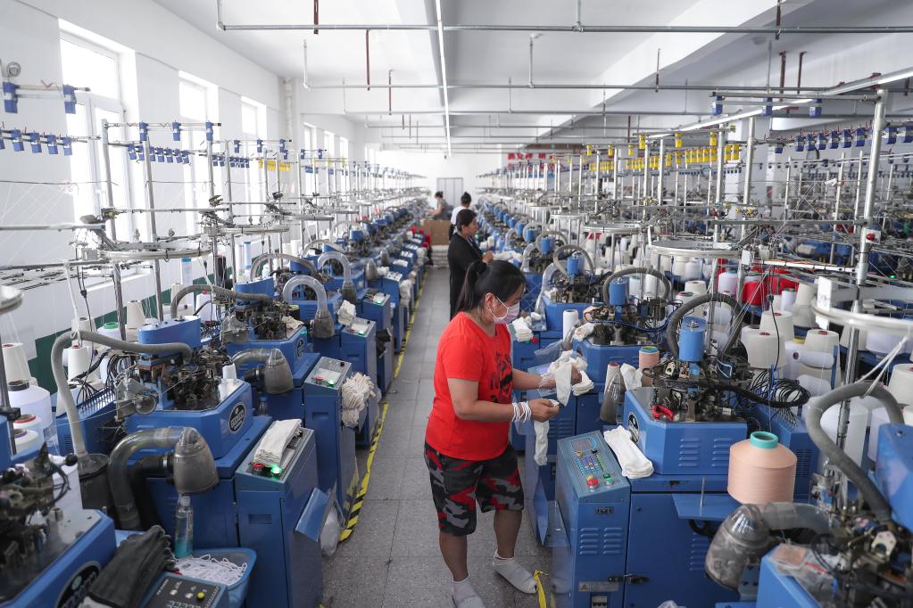 7月5日,工人在位于遼陽市遼陽縣小北河鎮的金絲雨針織廠加工襪子。