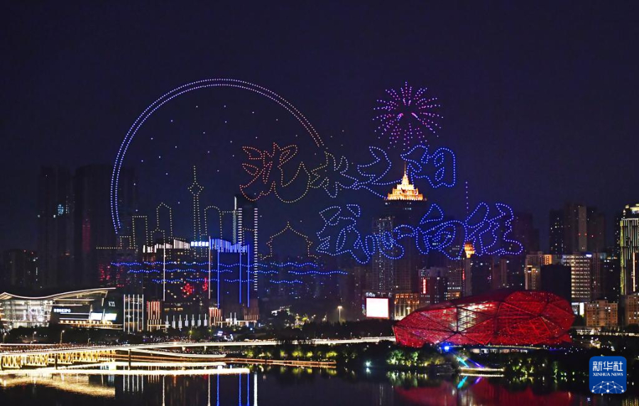 在沈陽渾河上空區(qū)域,無人機展示“沈水之陽我心向往”字樣。新華社記者楊青攝