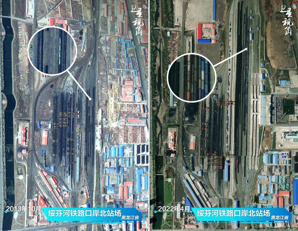 ↑2022年與2013年相比,綏芬河鐵路口岸貨運(yùn)列車增多,反映外貿(mào)活力增強(qiáng)。