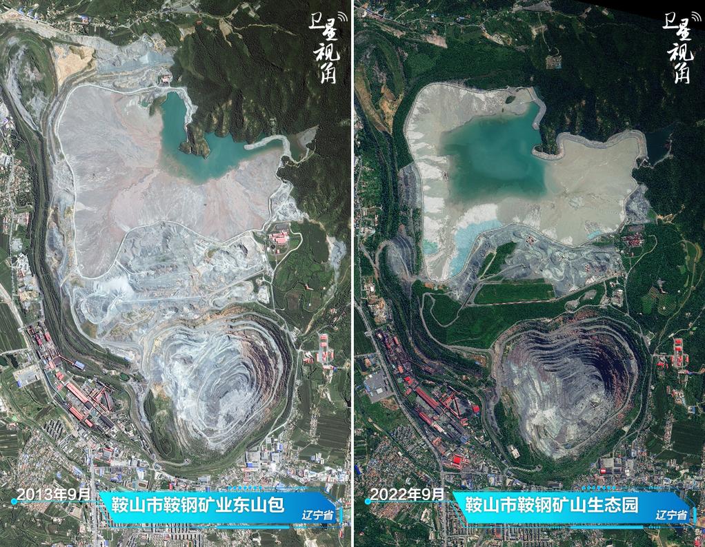 ↑2022年與2013年相比,曾經(jīng)塵土飛揚(yáng)的鞍鋼礦山,如今蛻變?yōu)闈M眼綠意的生態(tài)園。
