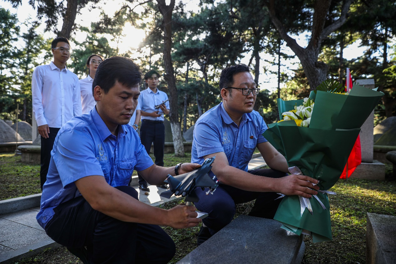 身穿“航空藍”的方文墨為志愿軍空軍烈士孫生祿敬獻花束,并將他的墓碑擦拭干凈。隨后,將一架沈飛生產的先進隱身戰機“鶻鷹”的模型放在墓前。“我們要接過英雄的接力棒,把祖國建設得越來越好!”方文墨說。