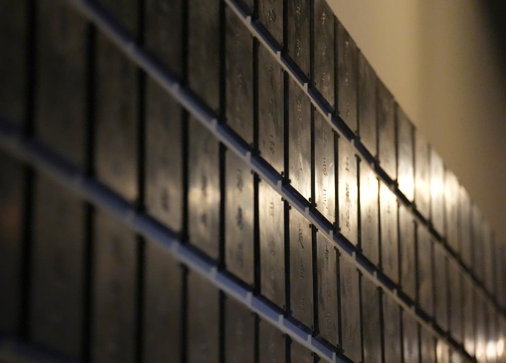在侵華日軍第七三一部隊本部舊址展出的殉難者名單墻(12月12日攝)。
