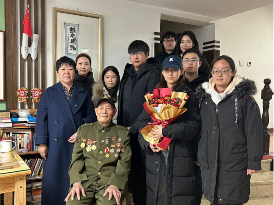 謝曉娟院長、蘇里老師帶領(lǐng)采訪團(tuán)隊(duì)與優(yōu)秀學(xué)生代表同抗美援朝老戰(zhàn)士王鳳和合影