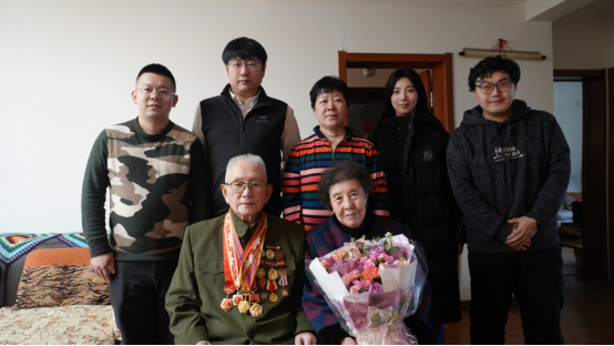 謝曉娟院長、蘇里老師和李蒙佐老師帶領(lǐng)采訪團(tuán)隊(duì)同抗美援朝老戰(zhàn)士楊化烽夫婦合影